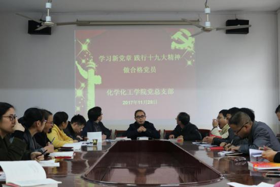 11月28日下午,化学化工学院党总支部在书记胡爱钦的带领下,组织全体教工党员认真学习了新党章,更好地学习贯彻党的十九大精神,进一步加强教工党员思想教育, 全面提升教工党员的党性,充分发挥党员的先锋模范作用。
