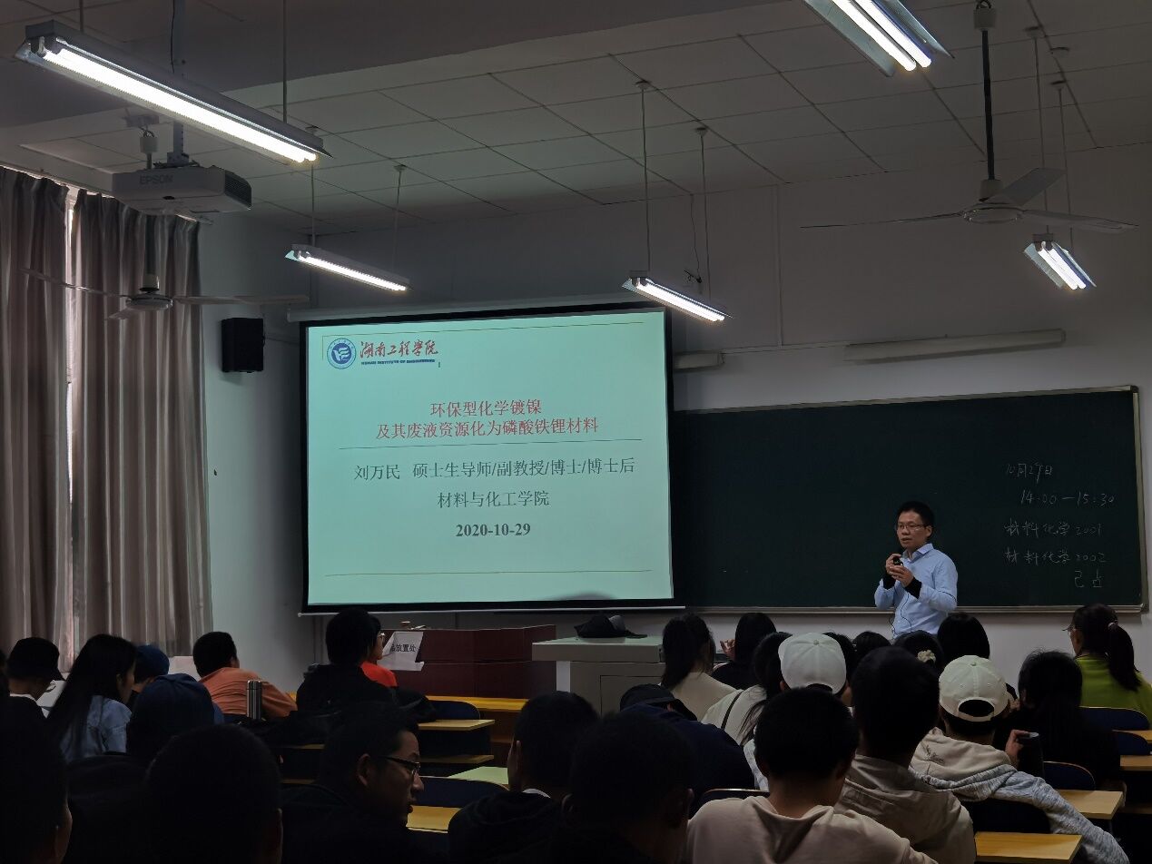 另外,10月29日下午,材料化学专业教研室主任刘万民在红楼203教室为专业学生开展了题为“环保型化学镀镍及其废液资源化为磷酸铁锂材料”的学术讲座。