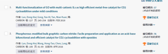 兰东辉博士在碳材料功能化方面的研究工作引起了同行专家的广泛关注,其在碳材料顶级期刊《Carbon》(SCI一区,IF=7.42)上发表论文4篇,其中2篇论文被遴选为ESI高被引论文(高被引论文是指在同年度同学科领域中被引频次排名位于全球前1%的论文)