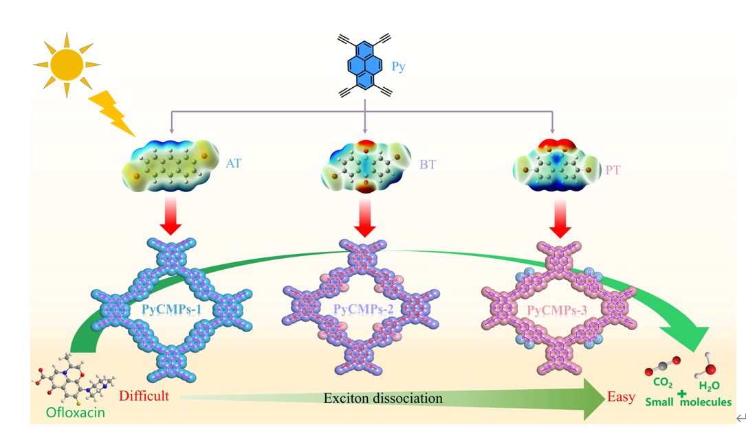 针对水环境中的抗生素和有毒金属等共存污染物对生态环境和人类健康造成双重污染问题,该团队基于应用半导体光催化技术,通过直接C-H芳基化策略构建了一系列共轭微孔聚合物(CMPs),该光催化剂不仅表现出显著的激子解离和分子间电荷转移,而且以显著的效率产生高通量的O2•−,实现了氧氟沙星高效氧化和铀(VI)高效还原。这项工作实现了CMPs同时去除水体环境中的有机污染物,将有助于开发基于CMPs的光催化系统来有效处理复杂的废水污染体系。研究成果以“Engineering Exciton Dissociation and IntermolecularCharge Transfer to Boost Superoxide Radical in Conjugated Microporous Polymers for Simultaneous Elimination of Coexisting Contaminants”为题在国际著名期刊《Chemical Engineering Journal》(中科院工程技术一区top期刊,IF:13.3)发表。麻豆a片