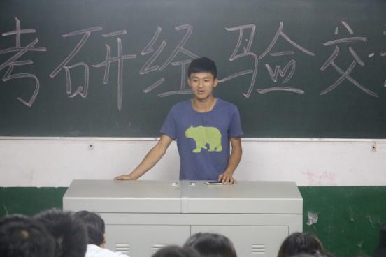 有91人报考,其中62人已确定被录取,考研上线率近70%。随后,龙晶上台发言,他从考研的意义、如何选择报考学校等方面结合自己的考研经验进行了精彩的讲解。他建议我们结合地理位置和工作几率等因素来选择报考学校。其中他详细地讲述了考研A区与B区的区别,两区按照经济发展程度和具体的地理位置来区分分数线,A区分数线高于B区。因此,我们在选择报考学校时应结合自身实际情况,切忌好高骛远。最后,他强调要想考出高分,学好英语是必需的,并就如何学好英语给了同学们一些建议。龙晶的详细讲解令同学们受益颇多。