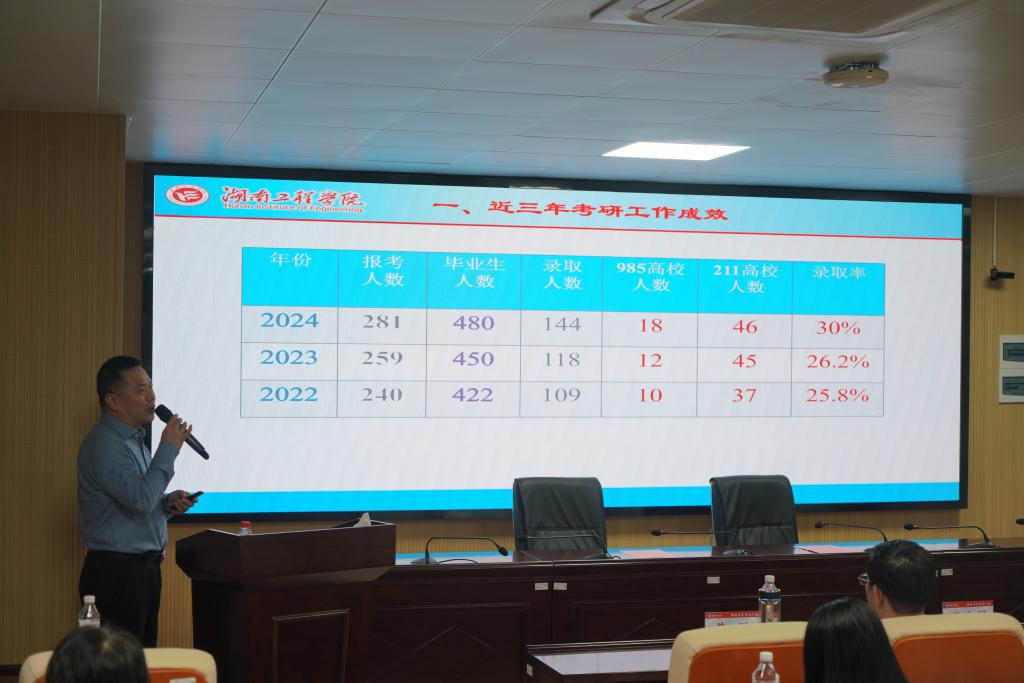 院长邓继勇作学院考研工作和卓越学风建设经验分享。邓继勇从学院近三年考研成绩情况和学院考研工作措施两个方面分享了学院推进考研工作的具体做法和有效举措。