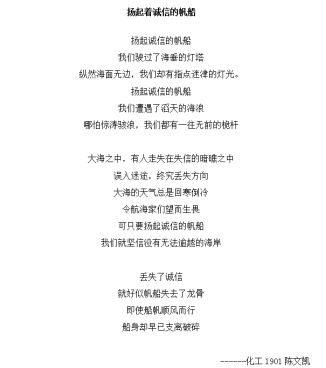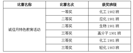 开展以“国与诚相待,我须信相还”为主题的诚信教育主题活动。各班级积极响应,在线上开展主题学习,同学们在班级群中发表学习心得,并创作了以诚信为主题的诗歌、绘画等优秀作品。最终,化工1902班获一等奖。