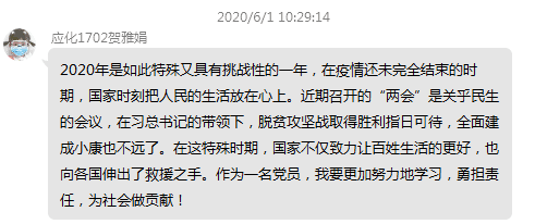 三个学生党支部开展了线上学习今年全国“两会”精神主题党日活动。会上,全体党员集中学习了《2020年两会特别报道:习近平的两会时间》、《政府工作报告》、微视频《人民至上》、2020年全国两会大型融媒体专题:《风雨无阻 奋勇向前》等内容,每位党员认真学习领悟,对重点内容进行摘抄、分享,实现线上线下同频共振,把思想和行动统一到习近平总书记重要指示和“两会”精神上来。