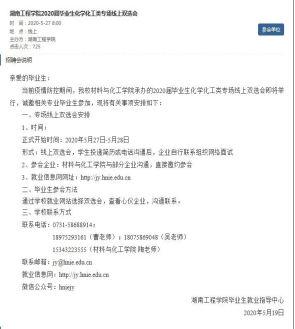承办的“2020届毕业生化学化工类专场线上双选会”举行。参会企业近30家,其中不乏央企、上市公司等优质企业,提供就业岗位逾300个。