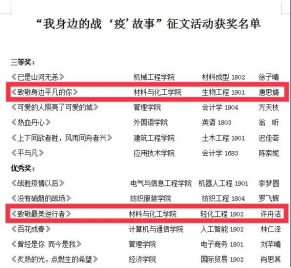 生物工程1901班唐思旖同学的作品《致敬身边平凡的你》获得三等奖,轻化工程1902班许舟洁同学的作品《致敬最美逆行者》获得优秀奖。