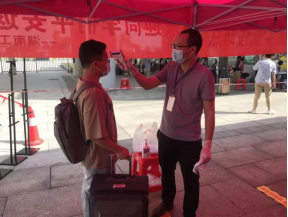 从5月19日零时起至20日24时,学院所有辅导员老师奔赴湘潭高铁北站、湘潭火车站、湘潭长途汽车站接驳学生。作为学生返校第一站,学生下车后必须经过全面消毒、测温、核验身份等流程,确保出站学生人人健康,再乘坐学校大巴直接驶向校区,确保所有学生与湘潭市无任何接触;另一方面在北校区大门口,学院领导及教工党员志愿者再次为学生做好体温测量、信息登记等服务。