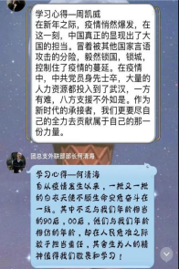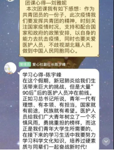 4月26日,响应校团委“五四精神 传承有我”主题活动号召,学院团总支书记柳芊给全体学生干部主讲了一次主题为“战‘疫’中的中国制度和中国精神”的特别网上团课。课后,同学们纷纷发表了学习心得。