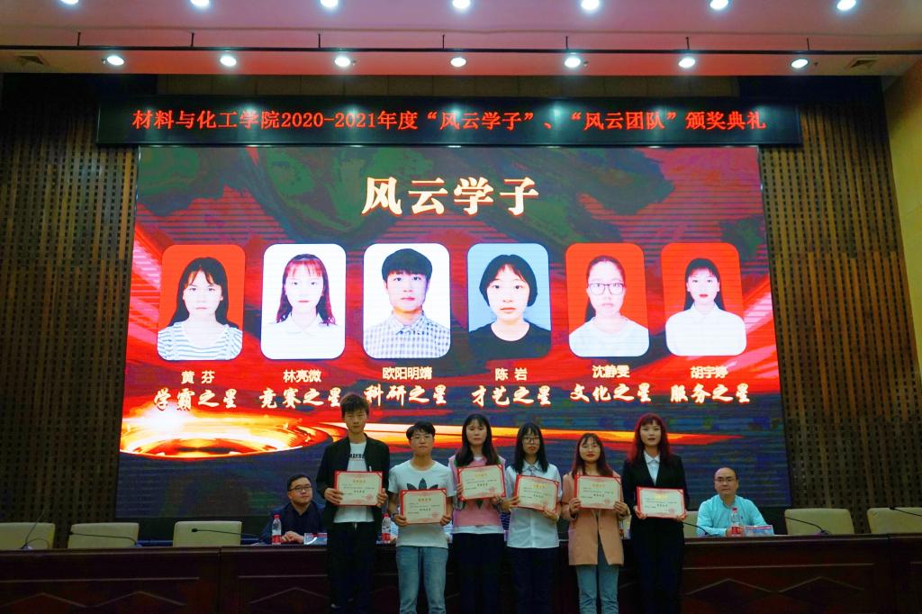 邓继勇宣读了学院“风云学子”“风云团队”获奖名单。颁奖仪式上,领导和嘉宾分别为“学霸之星”“竞赛之星”“科研之星”“才艺之星”“文化之星”“服务之星”“潜力之星”和“科研星团队”“竞赛星团队”“文体星团队”“寝室星团队”“潜力星团队”的获得者颁发荣誉证书。获奖学生代表、“竞赛之星”获得者、高分子材料与工程1702班林亮微表达了对学校及师长的感谢之情,她回顾自己的大学经历,鼓励大家找到自己的兴趣所在,不断努力拼搏、砥砺前行。