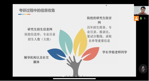 举办线上考研经验交流会,10位分别以优异成绩被湖南大学、中南大学、中国科学院大学等录取的2018级学生通过腾讯会议在线分享了考研经验及感悟。本次活动由学院辅导员王祥若主持,学院有意向考研的2019级学生和部分有考研规划的2020、2021级学生参加。