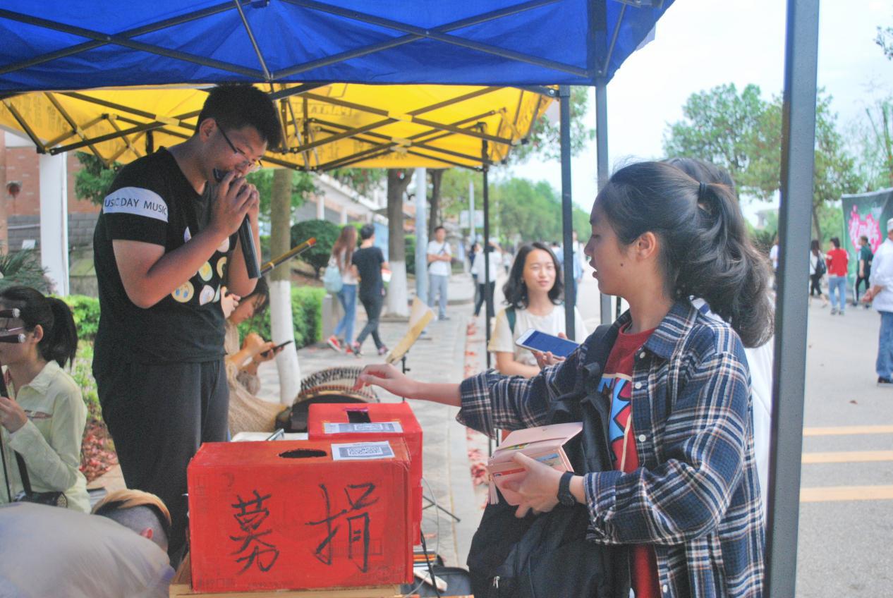 爱心社联合民族乐器协会、歌友协会、焦点音乐开展的“一元捐”爱心义演活动在明德二食堂门口、木鱼湖公园、学海二食堂门口同时摆点进行。