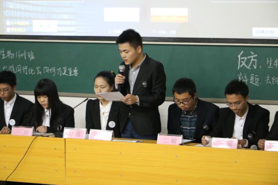 经过层层筛选,入围本次决赛的班级是生物工程1601班和生物工程1602班。本次辩论主要探讨与谁同行和去向何方二者何者更为重要。正方代表队生物工程1601班的观点是“与谁同行比去向何方更重要。”反方代表队则主张“去向何方比与谁同行更重要。”首先,正方一辩鲜明的亮出了他们的观点,反方一辩则首先承认与谁同行也很重要,但是相比之下,他们更加坚定去向何方更为重要,在这个环节中,反方队伍以气势取得先机。在接下来的环节中,双方三辩分别对对方一二四辩发问。双方都逻辑清晰,口齿伶俐。最后一个环节,是大家最期待的自由辩论时间,双方对手都纷纷提出自己的质疑并得到回答,场面热闹非凡。观众也都纷纷称赞。
