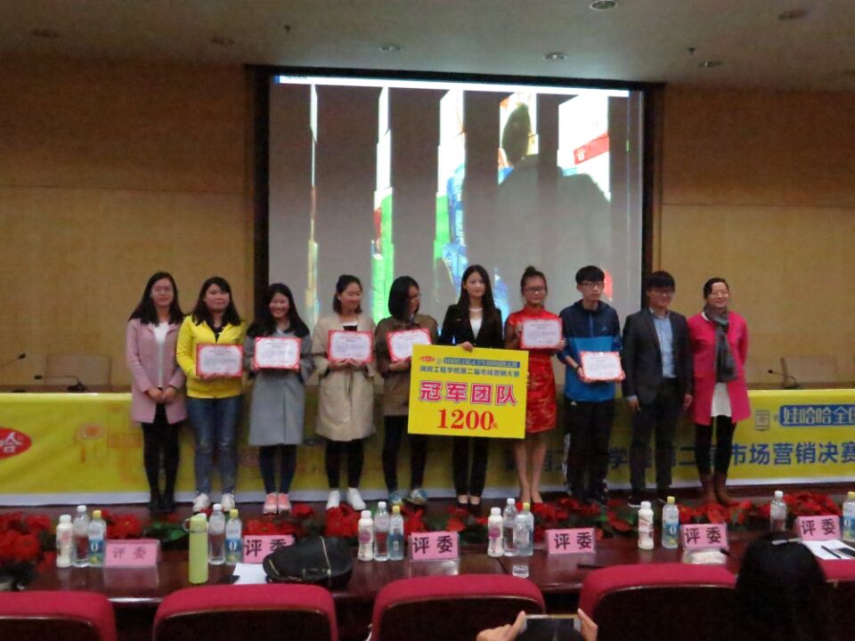 2016年11月17日晚7点,由麻豆a片 化学化工学院和外国语学院联合主办的娃哈哈市场营销大赛决赛暨颁奖典礼在图书馆二报告厅举行。参与本次颁奖典礼的评委有化学化工学院学办主任吴菲、外国语学院团总支书记张婷、娃哈哈公司湘潭站负责人蒋海清以及化学化工学院与外国语学院的部分学生干部,本次比赛颁奖典礼由化学化工学院高分子1601班的李弼珺同学主持。