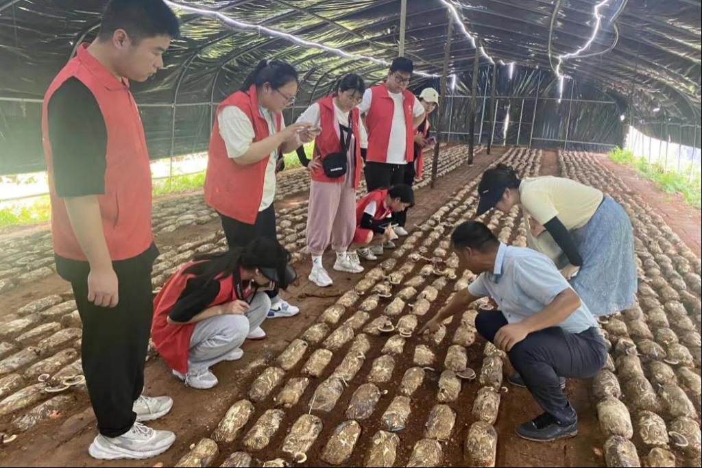 7月13日,实践团来到韶山银田镇银田村乡村振兴产业基地开展助农直播。志愿者们热情洋溢、轮番上阵向广大网友介绍基地概况、产品特色,与直播间网友们积极留言互动。志愿者在基地工作人员的引导下,带领直播间的网友们实地参观了蘑菇种植大棚,展示菌类的生长环境、种植方法,了解关于蘑菇、灵芝等菌类的一些基本知识,如生长周期、生长习性、种植技术等。