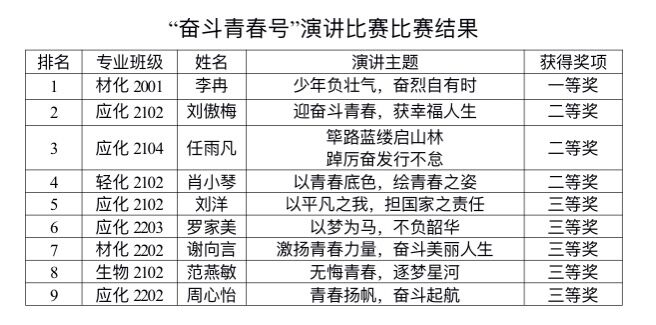 在新化工楼301室开展“奋斗青春号”演讲比赛。本次演讲比赛由纪检部干事肖校烨主持,团总支书记黄玲、学院团学社主席团成员担任评委。