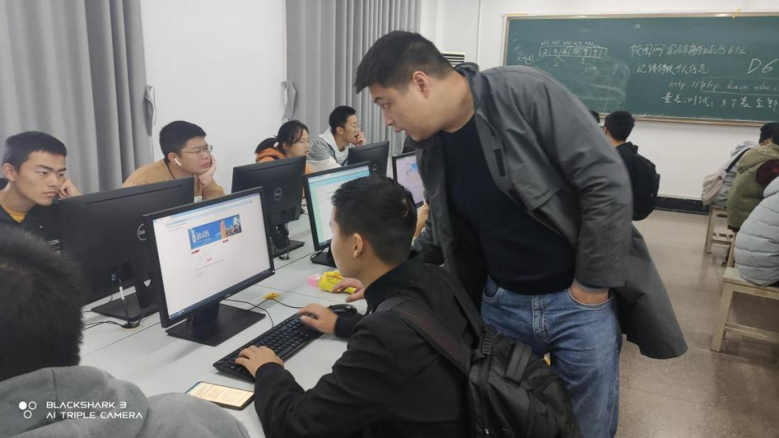 组织2021级新生在新校区机房进行心理普查,学院辅导员陶庆忠、2021级新生及心理联络部参加。