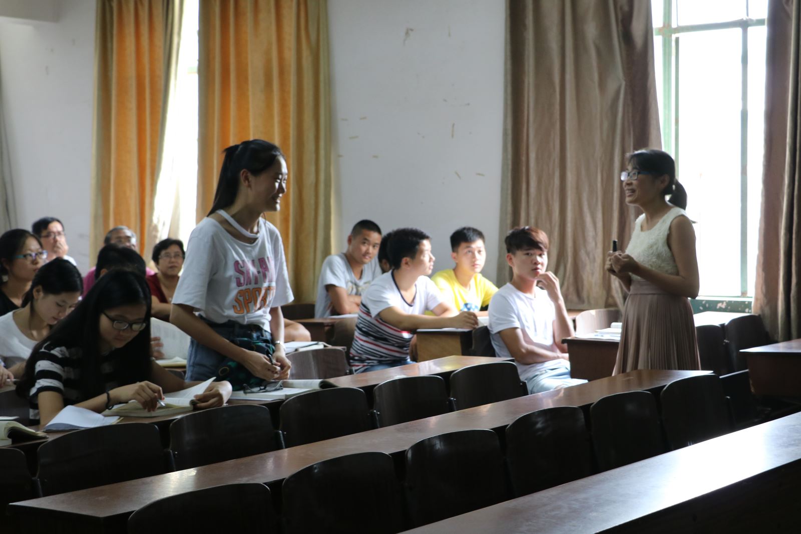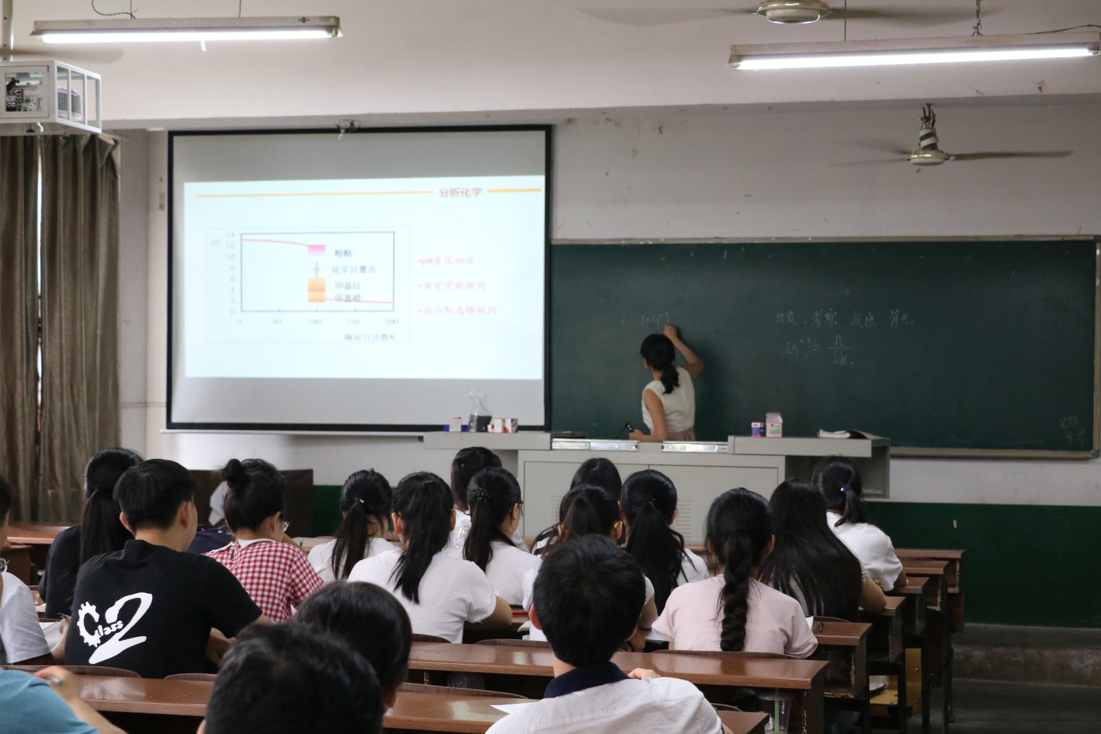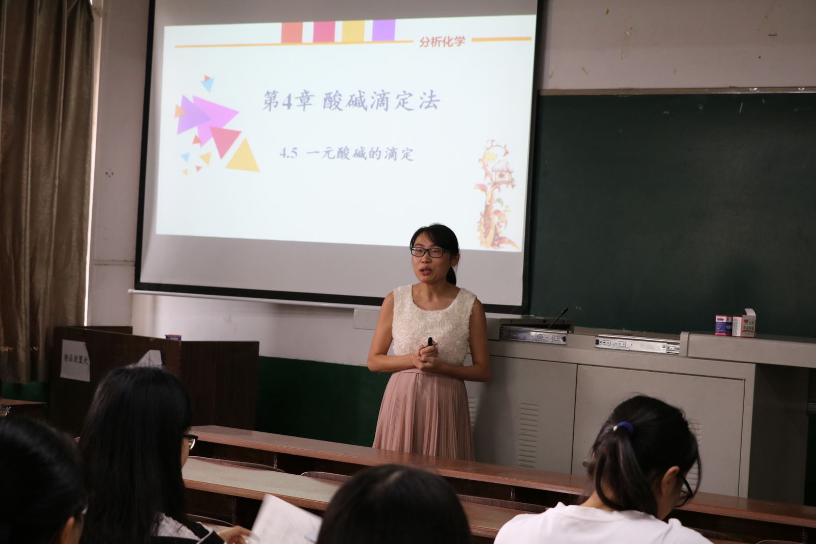 傅昕老师的授课主题是《分析化学》中的酸碱滴定法。在课堂上,她用通俗易懂的语言讲述了酸碱滴定的基本原理,酸碱滴定的滴定曲线,指示剂的选择和滴定的终点误差计算。为了使同学们能更积极主动地投入到课堂学习中,她把重要的知识点通过提问的方式来与同学们一起讨论。通过这种启发式的教学方式来传授知识,进一步提高了学生的学习主动性,同时也是鼓励学生积极参与到课堂学习。傅昕老师给大家呈现了一堂精彩的教学观摩课,让同学们深受启迪的同时也深深感染了在座的每一位老师。