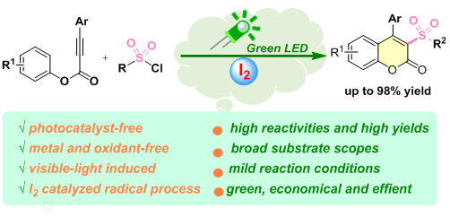 2019级研究生王强在光催化有机合成研究方面取得最新进展,相关研究成果以“Visible light mediated, iodine catalyzed radical cascade sulfonylation/cyclization for the synthesis of sulfone-containing coumarin under photocatalyst-free conditions”为题在国际有机类主流期刊《Asian J. Org. Chem.》(影响因子3.319)上发表。指导老师/通讯作者是易兵教授,共同通讯作者还有谭建平博士和谢艳军博士。