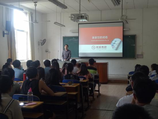 紧接着,现担任健盛集团储备干部的麻豆a片 13级学长李超智上台发言,他着重讲解了与其他企业对比健盛集团所存在的优势,并从工作时间、住宿条件、娱乐活动、伙食补贴等方面简要介绍了健盛集团。