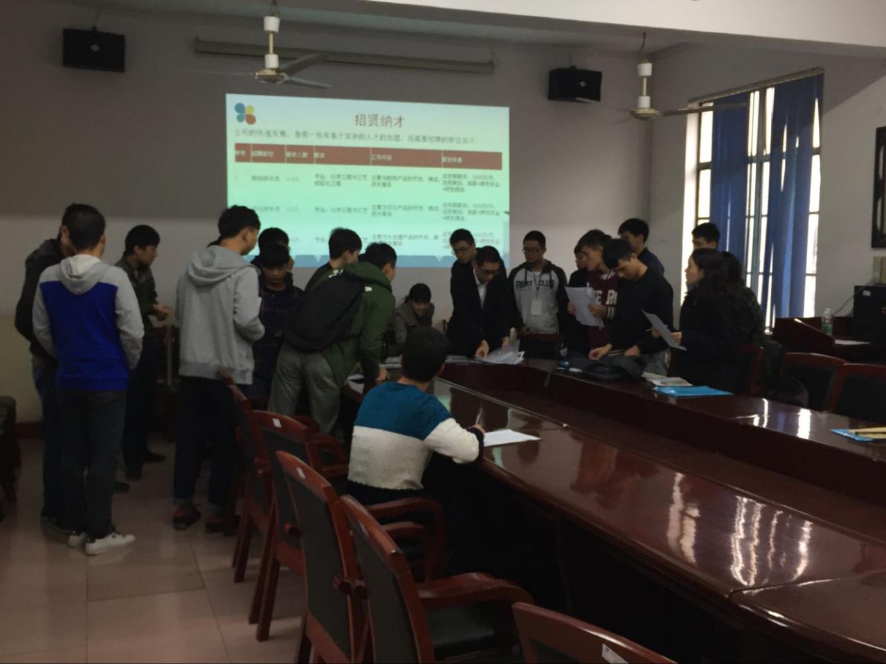 四教306举行了校园招聘会。参与此次招聘会的有该公司经理彭彦,人力资源部吴向富以及化工学院大四学生,此次招聘主要面向化工、轻化专业的学生。