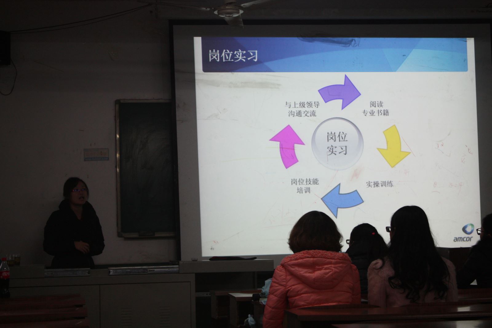 招聘员于艳庆以一个生活用品安全的视频引出话题,指出公司能给员工提供安全舒适的工作环境,完善的医疗保障,强调员工的工作安全是公司重点关注问题之一。为了进一步加深同学们对公司的了解,于艳庆就安姆科已成为食品、药品、化妆品等领域的领先包装商展开演说,结合ppt向同学们介绍了公司的发展概况、优厚的薪酬待遇、人才的培养计划、灵活的管理以及招聘专业和招聘岗位人数。在人才培养计划中,于艳庆对于公司的特色培训课程“我是特种兵”进行了强调。