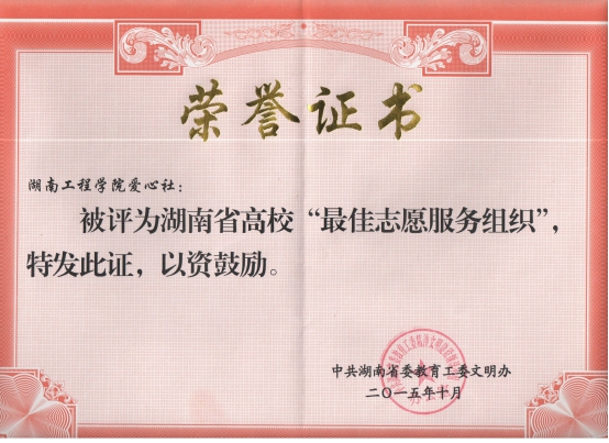 “爱心社”击败众多竞争对手,荣获湖南省高校“最佳志愿服务组织”称号。