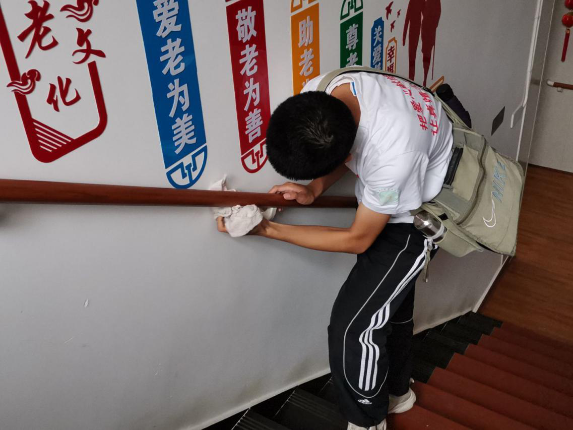 志愿者们怀着热忱的心,戴好帽子,面带灿烂的笑容礼貌地和敬老院中的老人打招呼,在明确分工后,高大的男生们主动承担起打扫卫生的体力活,仔细地清理楼道间、擦净把手上的灰尘,而细心温柔的女生就帮助行动不便的老人倒茶水、拿东西,搀扶他们走动,帮他们揉肩擦药,还为他们削水果。还有一些志愿者们拿起话筒一展歌喉,引得一旁的老人跟着鼓掌附和,欢声笑语满怀。
