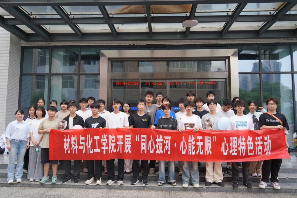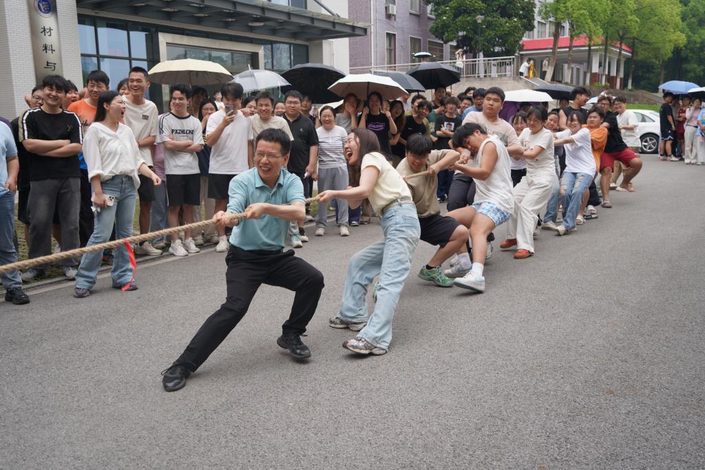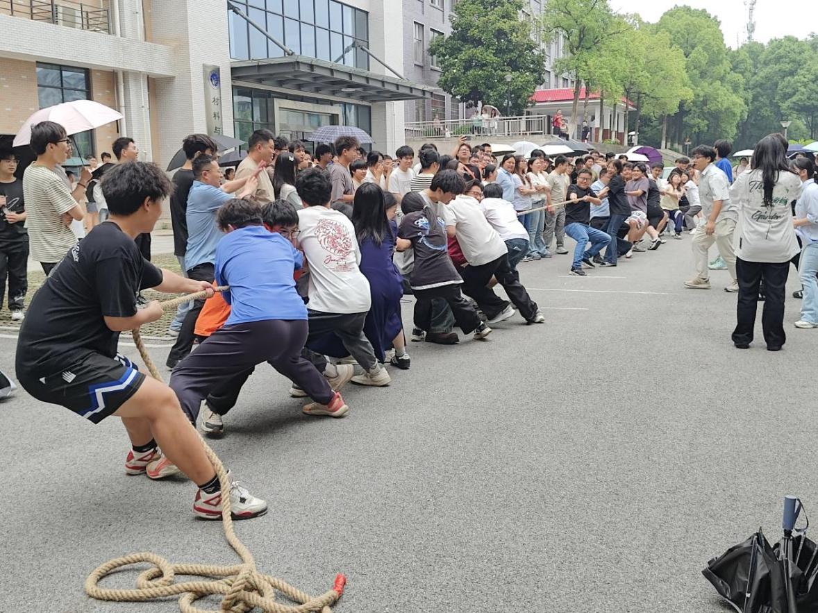 在材化楼前广场举办“同心拔河·心能无限”师生拔河比赛,吸引了众多师生积极参与。