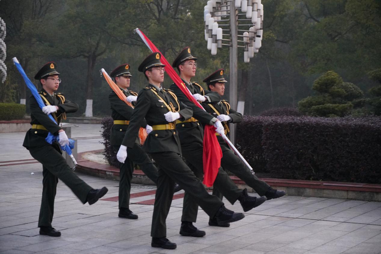 清晨7时,国旗护卫队迈着整齐有力的步伐护,护送国旗至升旗台。在雄壮的国歌声中,五星红旗冉冉升起,全体师生肃立注目,表达对祖国的崇高敬意。