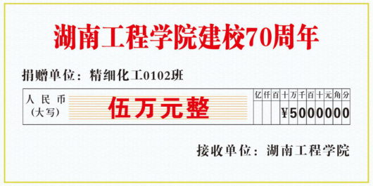 值此建校70周年之际,怀着对母校浓浓的情谊,精细化工0102班捐款5万元,用于设立学生助学金。希望学弟学妹们感受到这份深深校友情,怀着感恩之心,将这份温暖传承下去,以优异的成绩回报校友的情谊,回报学校的培养。