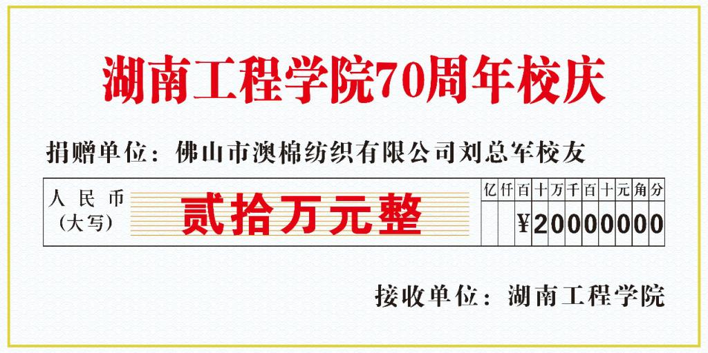 染整工程(现轻化工程专业)00311班刘总军为母校建校七十周年捐赠20万元,用于新化工大楼建设。