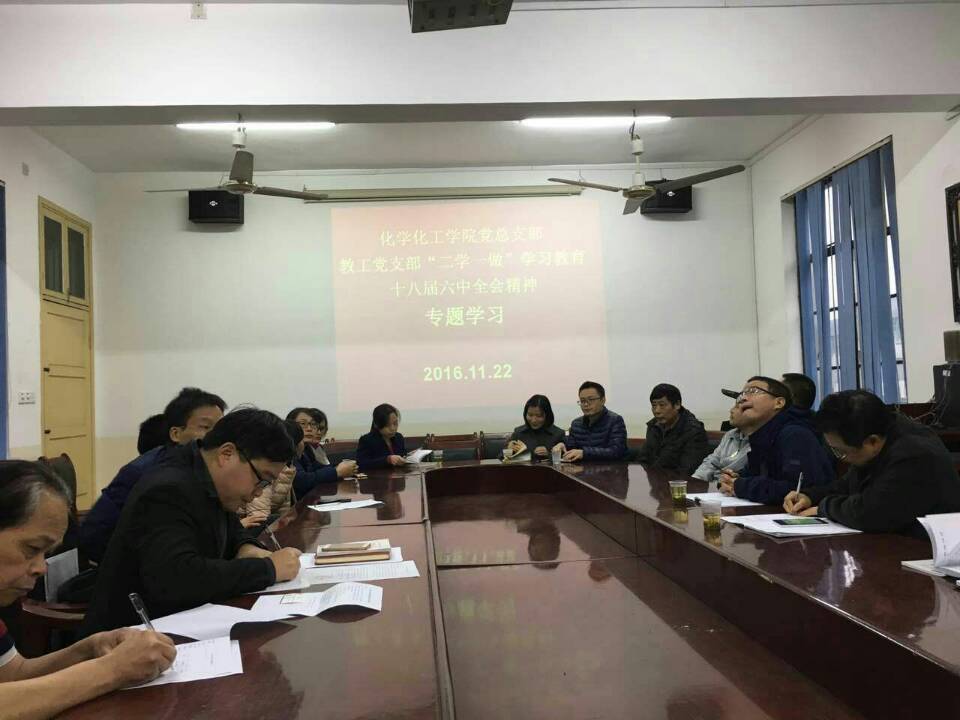 2016年11月22日,化学化工学院党总支召开全体教工党员大会,学习贯彻十八届六中全会精神。会议由学院党总支书记胡爱钦主持。