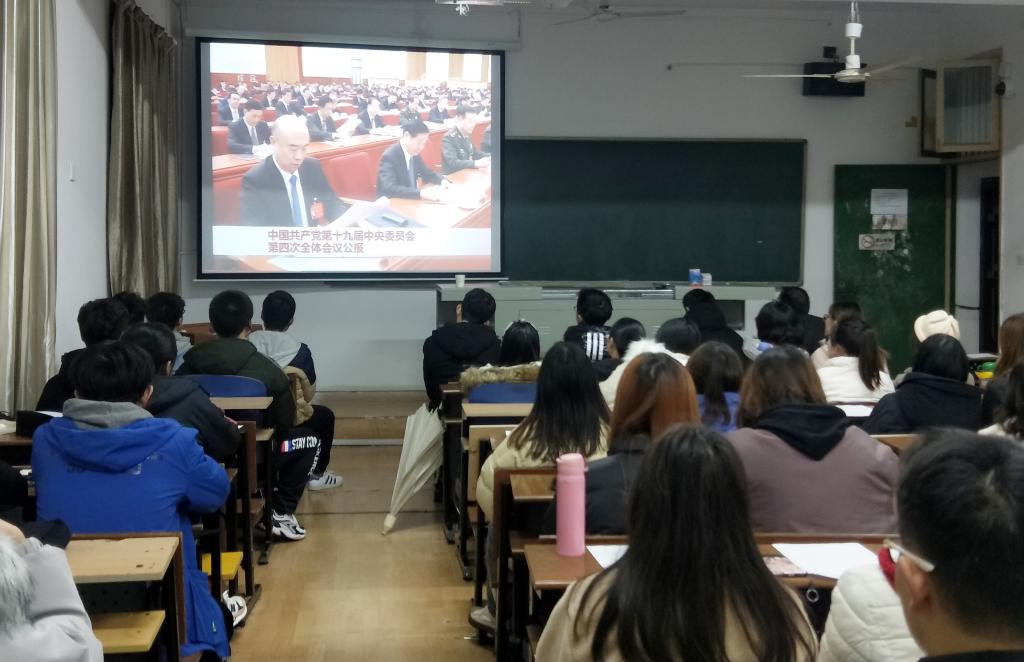 最后,同志们集体观看了中央电视台新闻联播《中国共产党第十九届中央委员会第四次全体会议公报》专题片。