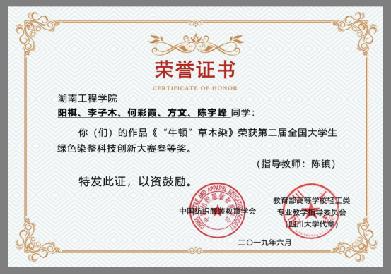 陈镇老师指导的轻化工程15~17级本科生团队阳祺、李子木、何彩霞、方文、陈宇锋的携作品《“牛顿”草木染》突出重围,代表麻豆a片