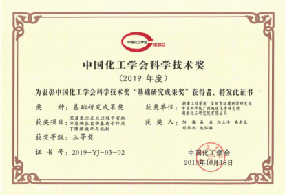 百名骨干人才工程第一层次人才”等奖项。成果“高浓度有机印染废水的一体化处理回用技术”和“深度氧化与微生物联用处理有机污染物一体化技术”先后运用于深圳环境科学研究院、深圳市森航环保工程有限公司、湖南金旅环保有限公司等10余家企业,创造了显著的经济价值。